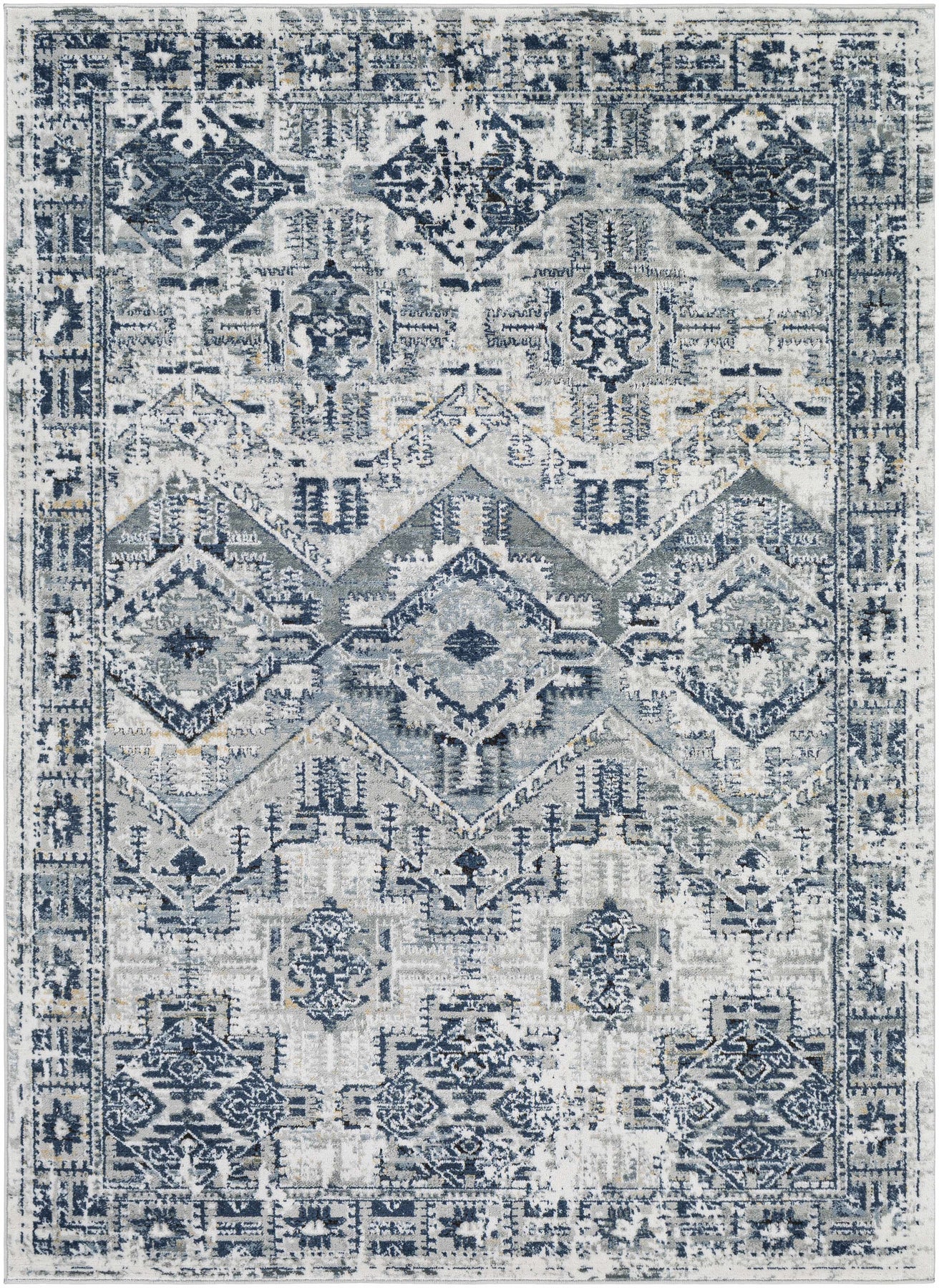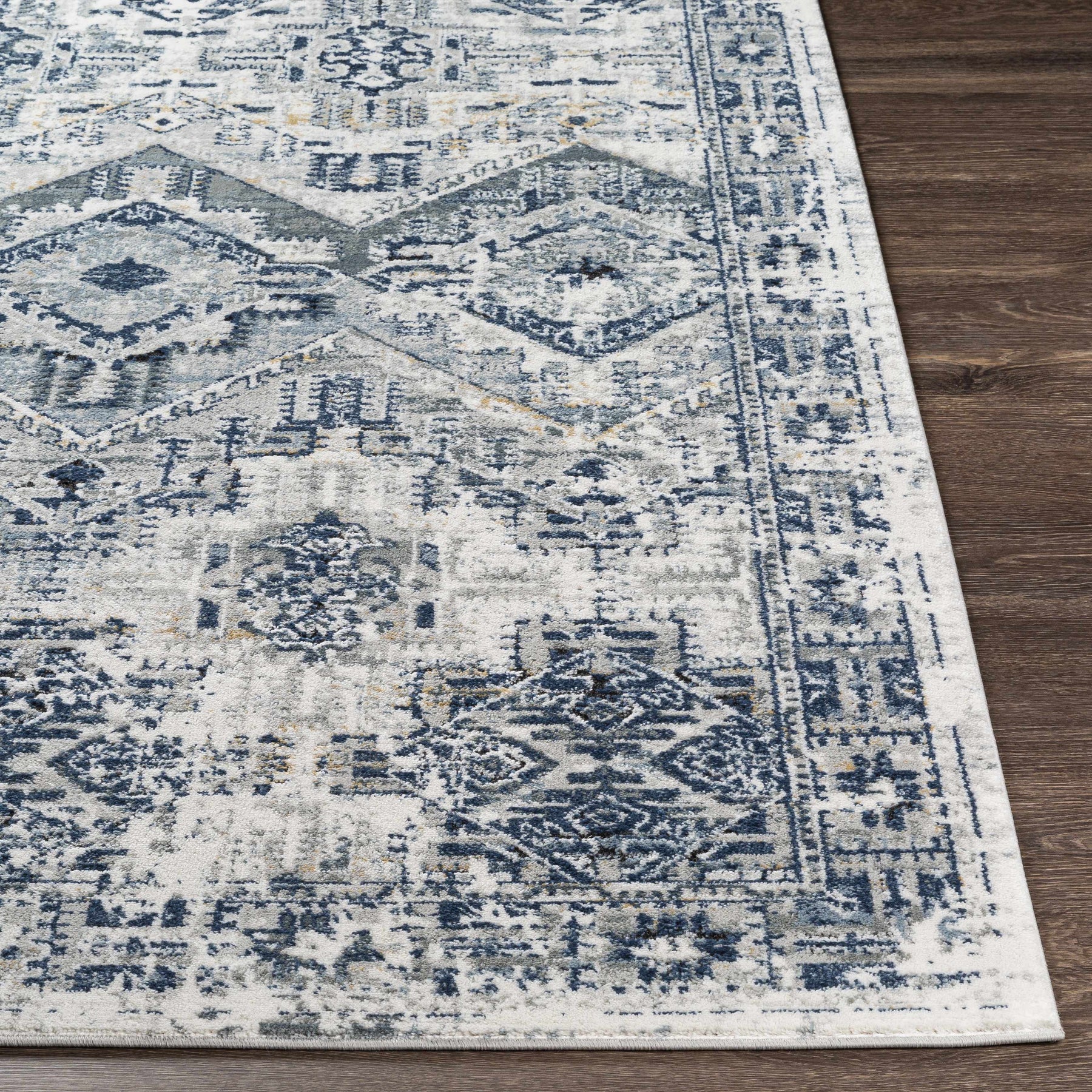 Blue and beige traditional Puriton Area Rug with medium pile in modern living room setting